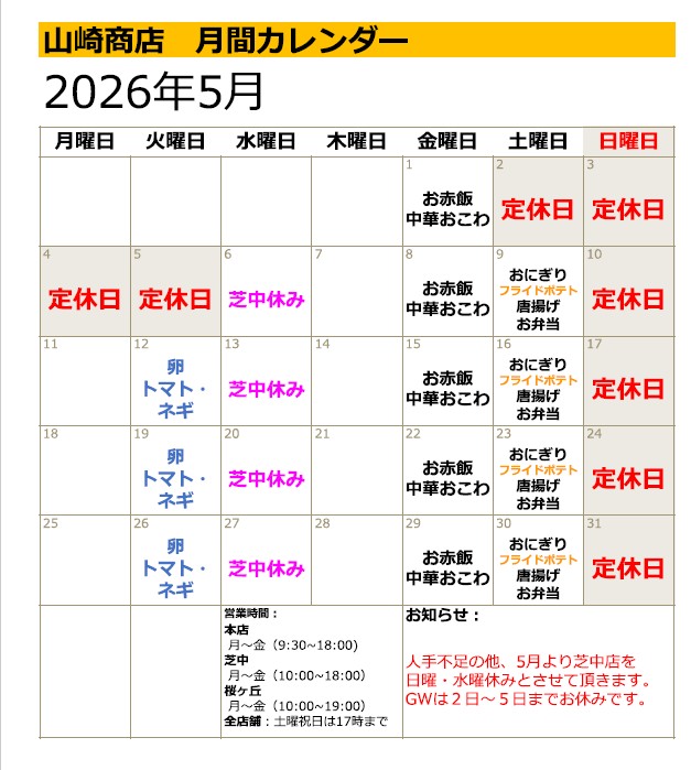 - 芝中店の営業日変更について平素は大変お世話になっております。人手不足により、芝中店のみ2026年5月から日曜・水曜休みとさせて頂きます。… 続きを読む: 芝中店の営業日変更について