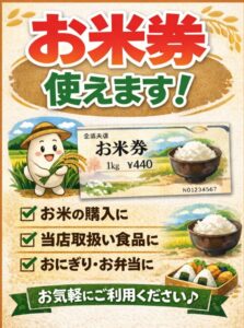 弊社の全店舗でおこめ券の取り扱いが可能です。